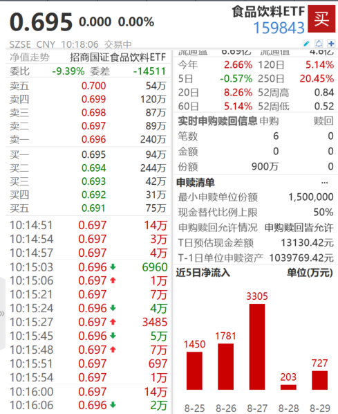 9月1日,白酒板块迎来回调,个股方面,山西汾酒下跌1.09%,贵州茅台、五粮液、泸州老窖小幅下跌。据Wind金融终端,食品饮料ETF(159843)盘中获900万份净申购,资金连续五日净流入超7400万。