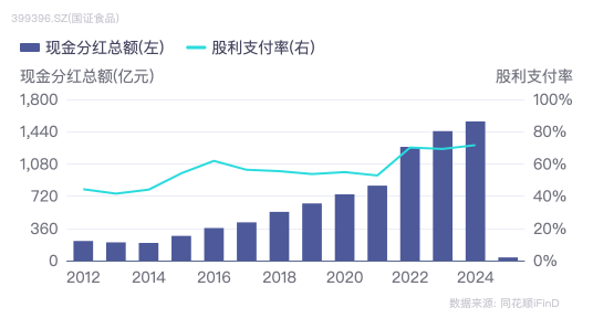 同时,作为传统的分红大户,食品饮料行业的现金分红总额正呈现逐年上升趋势,2022-2024年连续三年的股利支付率维持在70%左右。据iFind,食品饮料ETF(159843)标的指数的最新股息率为3.3%。
