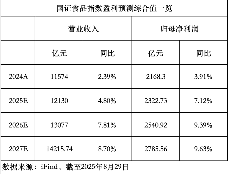 据2024年年报,国证食品指数成份股的营业收入同比增速为2.39%,归母净利润同比增速为3.91%。据iFind预测,2025年-2027年期间,食品饮料板块(以国证食品指数为例)的预计营业收入、归母净利润将呈现逐年上行趋势。